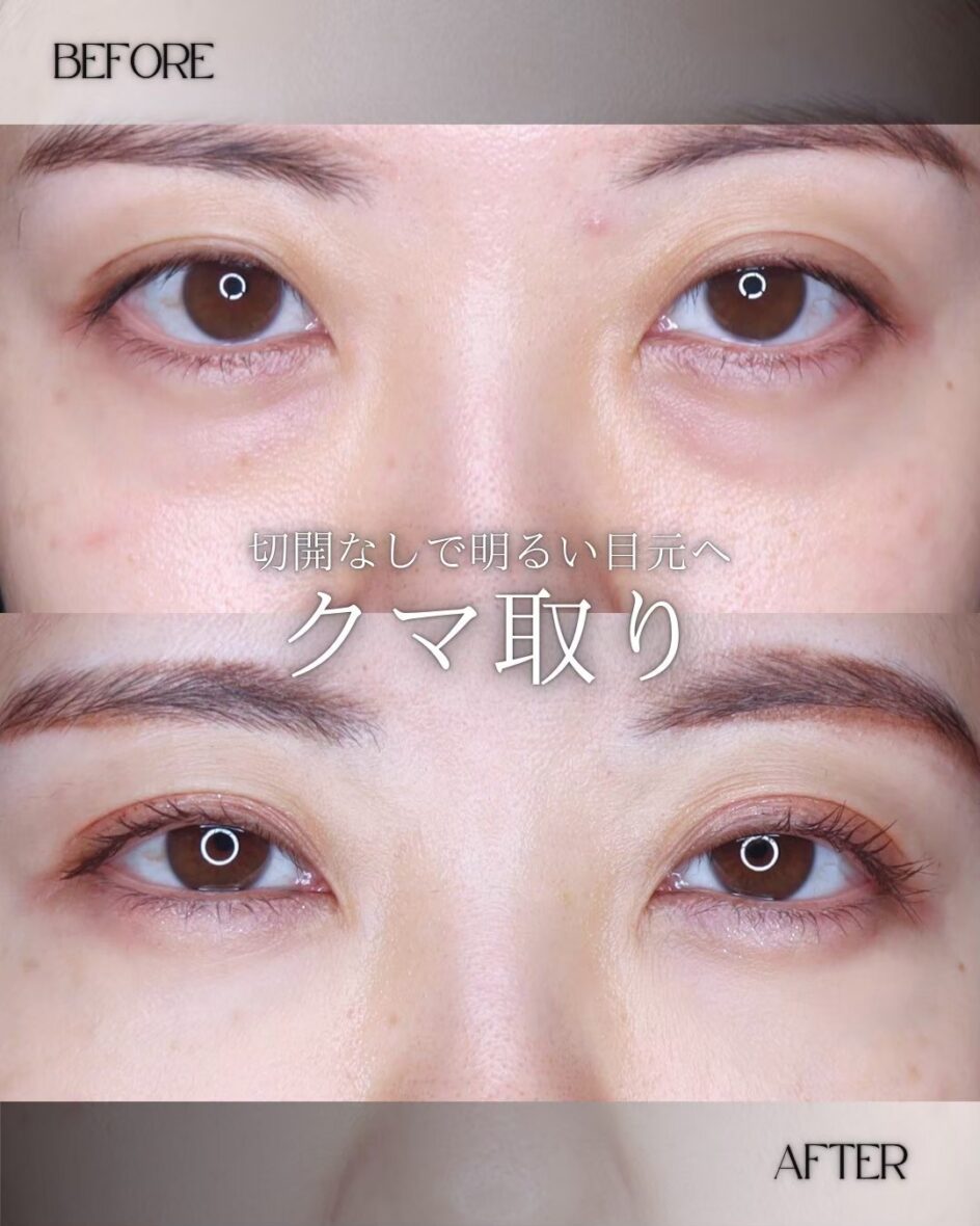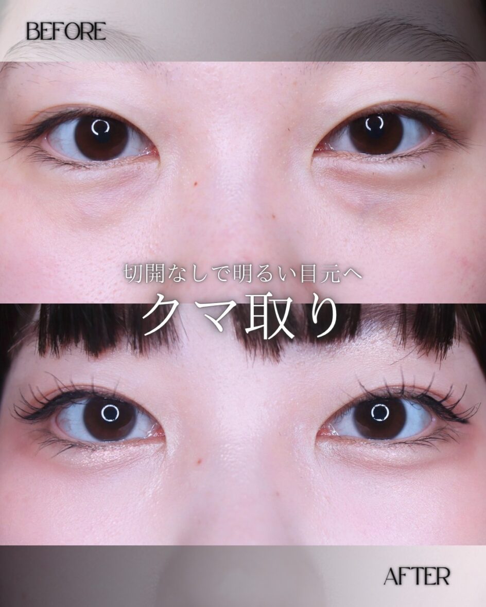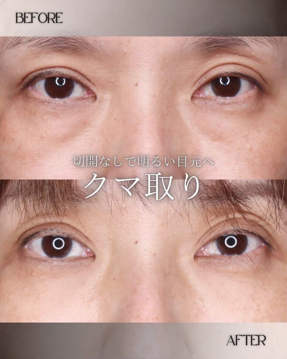 下まぶたのふくらみを取る施術です。 目の下のクマの原因の一つとして眼球周囲に付着している眼窩脂肪と呼ばれる脂肪が重力で下に落ちてくることで下まぶたがふくらみ、クマやたるみを引き起こします。この眼窩脂肪を下まぶたの裏側から取り出すことで、目の下のふくらみ・クマが目立つ、疲れていたり老けて見える、という状態を解消します。 まぶたの裏側を切開するので傷跡は外からは基本的にはわかりません。