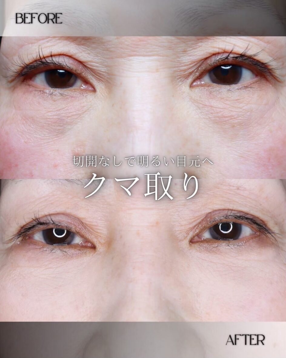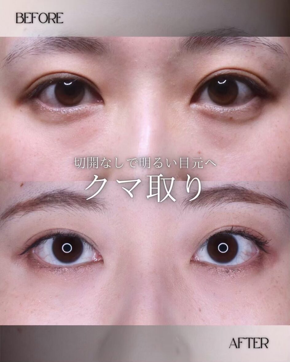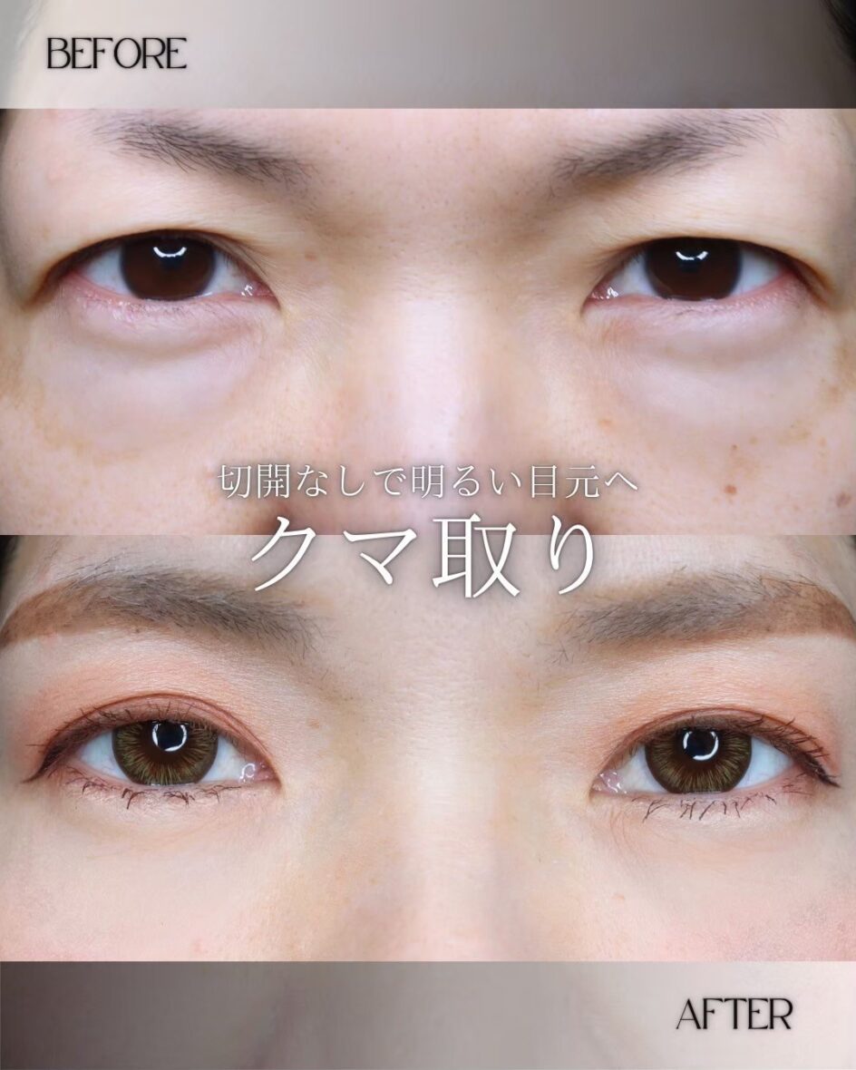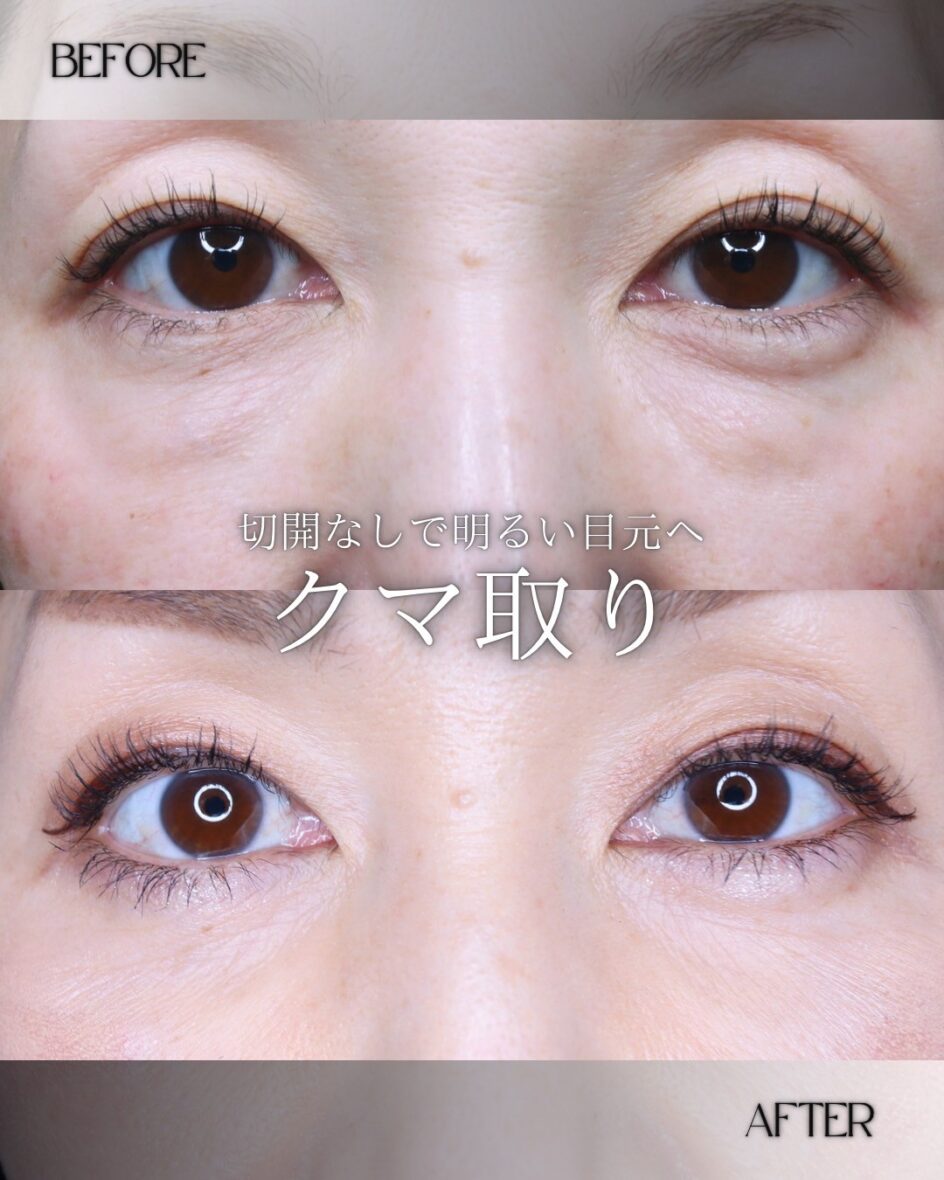 下まぶたのふくらみを取る施術です。 目の下のクマの原因の一つとして眼球周囲に付着している眼窩脂肪と呼ばれる脂肪が重力で下に落ちてくることで下まぶたがふくらみ、クマやたるみを引き起こします。この眼窩脂肪を下まぶたの裏側から取り出すことで、目の下のふくらみ・クマが目立つ、疲れていたり老けて見える、という状態を解消します。 まぶたの裏側を切開するので傷跡は外からは基本的にはわかりません。