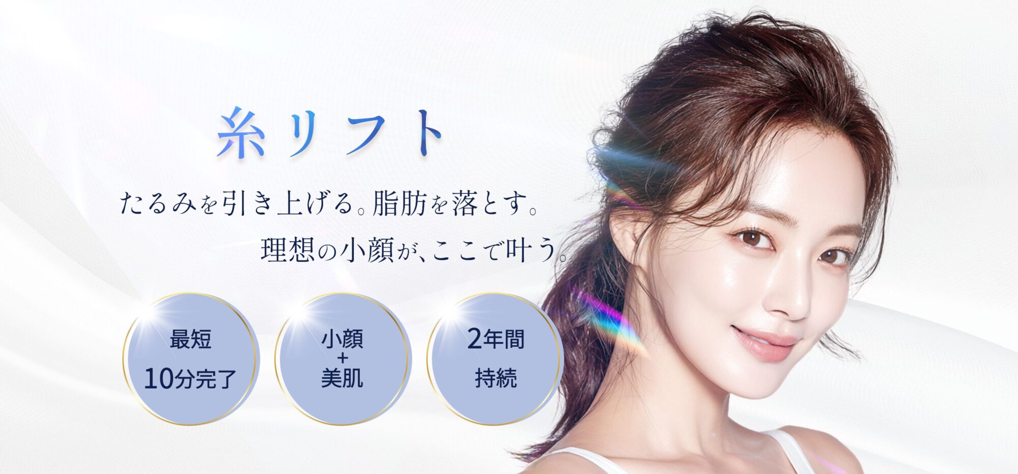 フェイスラインやほうれい線に向かって特殊な糸を挿入し、持ち上げることで気になるたるみをリフトアップする施術です。