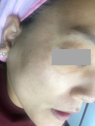 施術後すぐにシミが薄くなるわけではなく、レーザー照射後に一時的にシミが濃くなり、徐々に薄くなります。完成には約2週間ほどかかることが多いです。