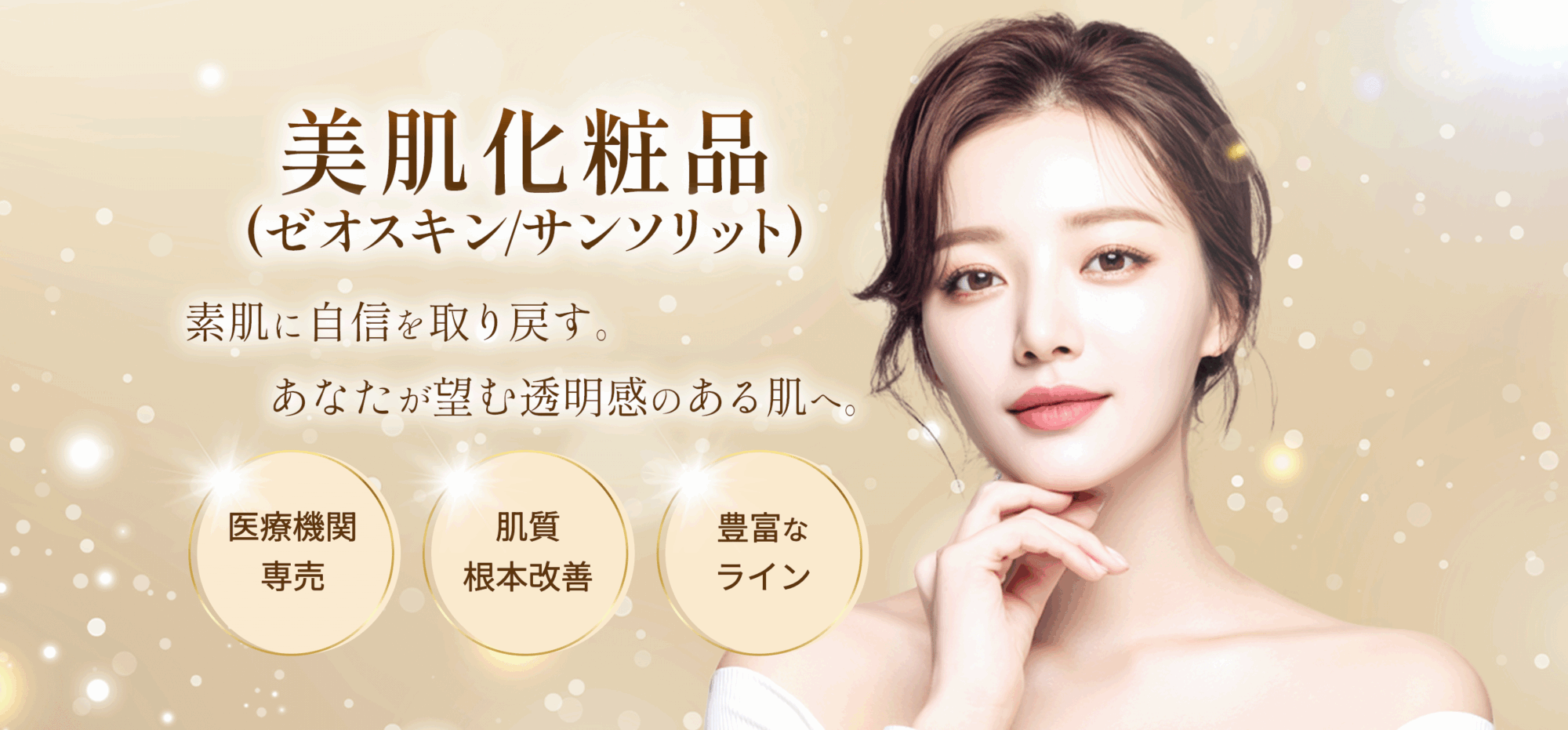 ゼオスキンは、肌の再生を促し、シミ・くすみ・ハリの低下などの肌悩みに効果的な医療機関専売のスキンケアラインです。ビタミンA(レチノール)を中心とした処方で、肌のターンオーバーを正常化し、健康で透明感のある肌へ導きます。