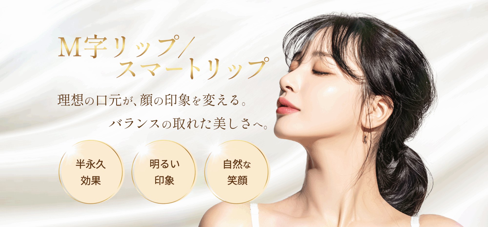 M字リップ形成やスマートリップは、唇の形を整え、より美しいバランスを作るための施術です。M字リップは上唇や下唇の形を整えて、魅力的で立体的な口元に仕上げます。スマートリップ(口唇縮小)は唇のボリュームを調整し、自然でスッキリした印象に整えます。また、ガミースマイル修正は、笑ったときに歯茎が目立つ方のための施術です。